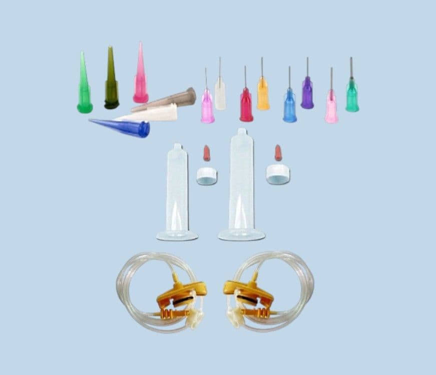 Dispensing tips and syringe barrels are designed to work with most low, medium and high viscosity fluids, adhesives, inks, pastes, gels and lubricants.