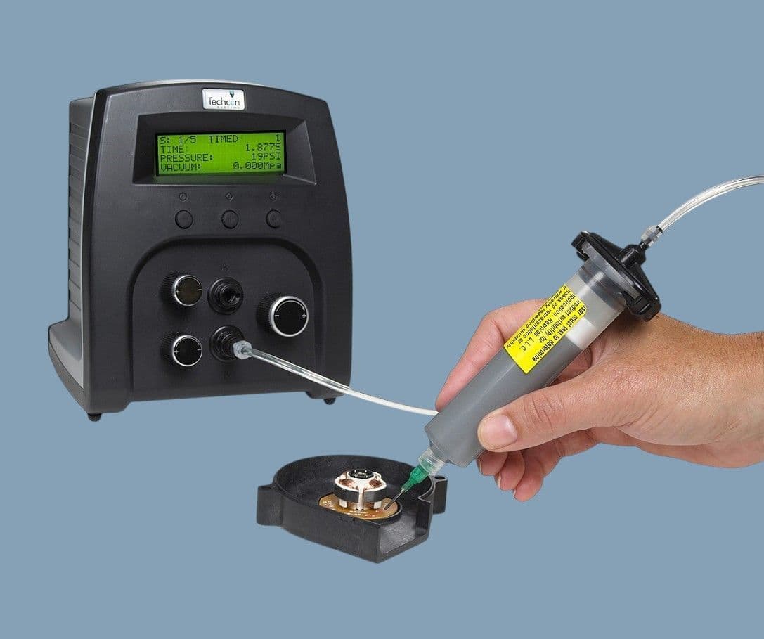 You hold the syringe like a pen, adjust the air pressure to suit your liquid being dispensed and press the foot pedal to dispense. When the foot pedal is released, the deposit instantly stops without drips or oozing. It is safe and simple to use and reduces time spent manually applying liquids. The TS350 range offer high precision control over watery liquids to thick pastes in a compact bench top system.