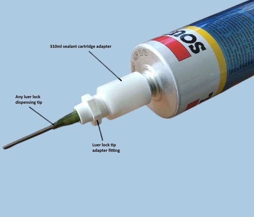 This kit is supplied with an aluminium metal 310ml cartridge retainer and air cap with airline hose to attach directly to the dispensing unit. So dispensing direct from silicone sealant or caulk tubes is simple. Set the air pressure, the timer and go. Or switch off the timer for making lines and beads.