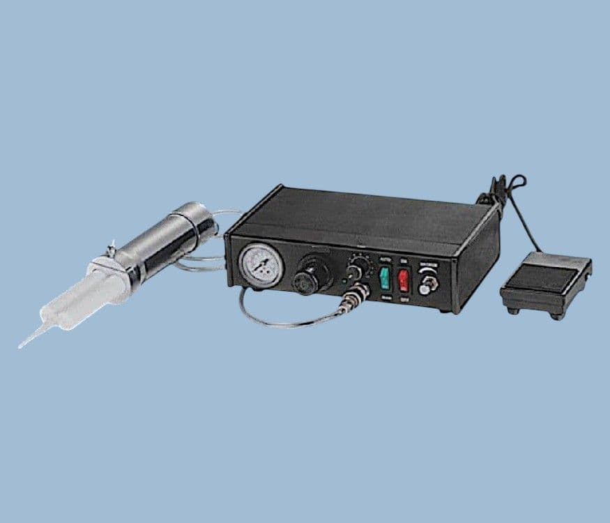 Bench top dispensing systems for the controlled application of repeat deposits from 50ml 10:1 ratio dual epoxy, doming resin, polyurethane cartridges. Analog timer with adjustable air regulator and a vacuum suck back to pull the 50ml rods back when changing over cartridges.