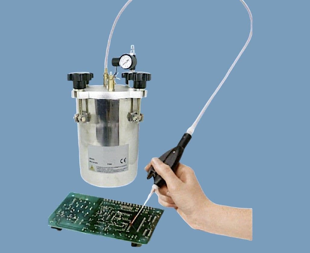 For CA's, dispensing tips supplied are Teflon lined to prevent rapid clogging of the adhesive. Using Teflon tips allows the operator to dispense without it blocking too quickly in between breaks or them having to replace tips too often. An assortment of others tips are included for dispensing UV cure, primers, inks, solvents and other fluids.