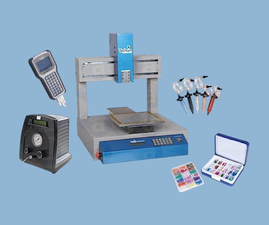 All robots are supplied with a digital pneumatic dispensing controller unit and I/O cable link along with bracket and slide assembly to use with 30cc/55cc size syringe barrels. For use with valves, other brackets are available to order separately.